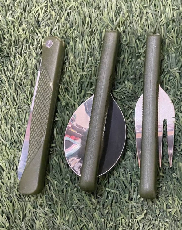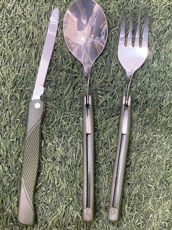 معرفی یک عدد قاشق چنگال وچاقوی تاشو در داخل کیف مخصوص حمل قرار داده شده است در هنگام باز کردن طول این وسایل به20سانتی متر میباشد ودرموقع تا شدن طولخ12 سانتی متر است که میتوان آن را به. راحتی در جیب شلوار کیف داشبورد وماشینو.....قرار داد