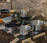 کمپکت و قابل حمل: ابعاد کل مجموعه به صورت پک شده 22×13.6 سانتیمتر است که نشاندهنده طراحی جمعوجور و کمحجم این ست ظروف است. با وزن کل 1680 گرم، این مجموعه بسیار سبک و مناسب برای حمل در سفرهای کمپینگ و کوهنوردی است.