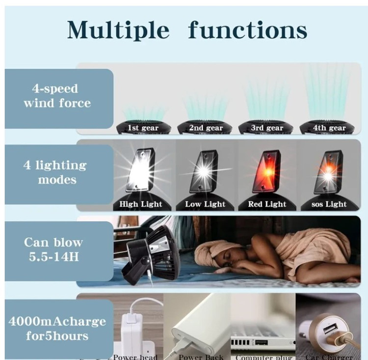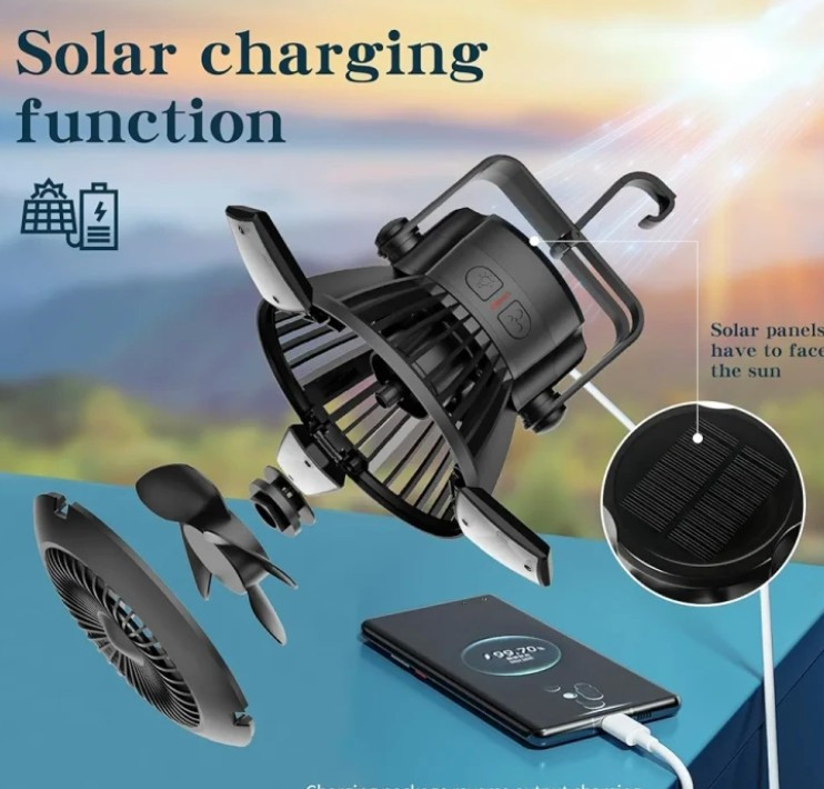 کمپینگ و کوهنوردی: این دستگاه برای روشنایی شبانه و همچنین ایجاد باد ملایم در طول شب یا هنگام استراحت بسیار مفید است. چراغ آن میتواند محیط چادر شما را روشن کند و پنکه برای تهویه هوا در شرایط داغ یا مرطوب به کار میرود.