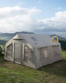 ستونهای هوای قابل باد شدن: این چادر به جای استفاده از قطبهای فلزی یا چوبی، از ستونهای بادی PVC استفاده میکند که به سرعت و به راحتی باد میشوند و استحکام لازم را فراهم میکنند. این ویژگی نصب چادر را بسیار آسان میکند و به راحتی میتوانید چادر را در هر مکان و در زمانی کوتاه برپا کنید.