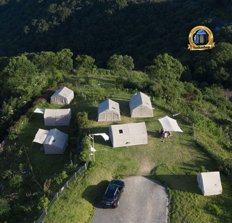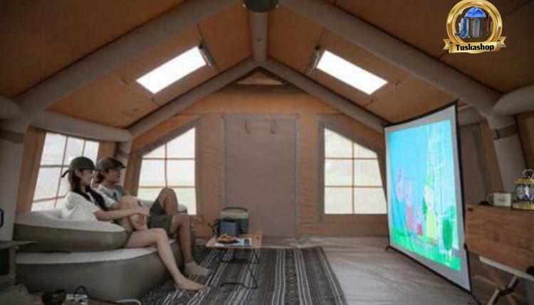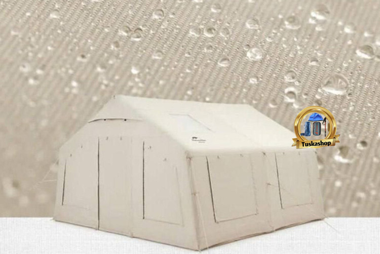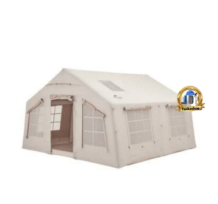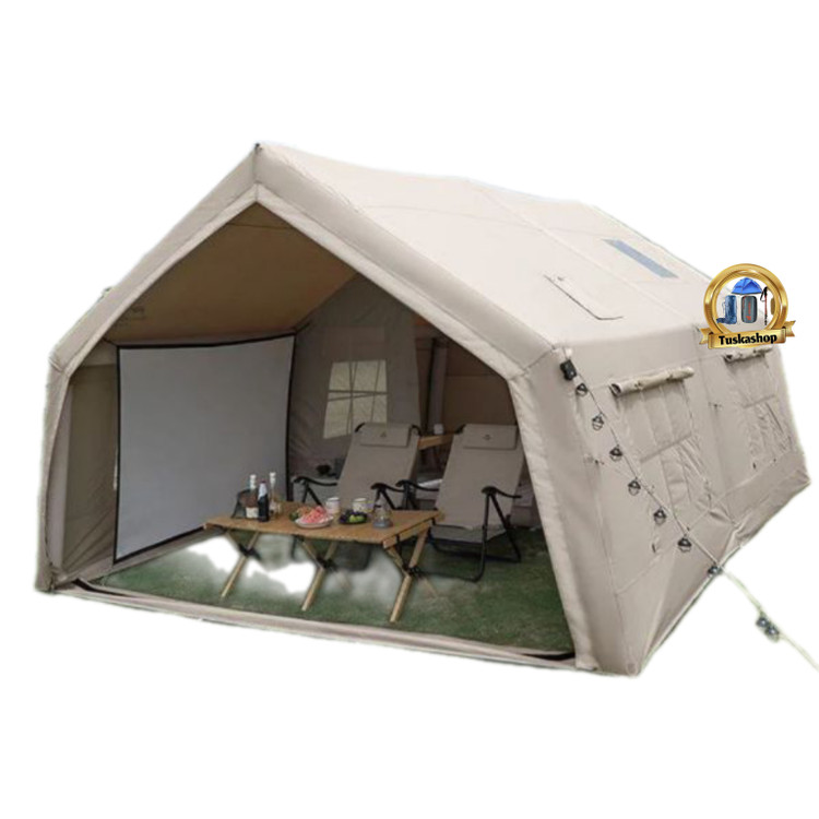 ستونهای هوای قابل باد شدن: این چادر به جای استفاده از قطبهای فلزی یا چوبی، از ستونهای بادی PVC استفاده میکند که به سرعت و به راحتی باد میشوند و استحکام لازم را فراهم میکنند. این ویژگی نصب چادر را بسیار آسان میکند و به راحتی میتوانید چادر را در هر مکان و در زمانی کوتاه برپا کنید.