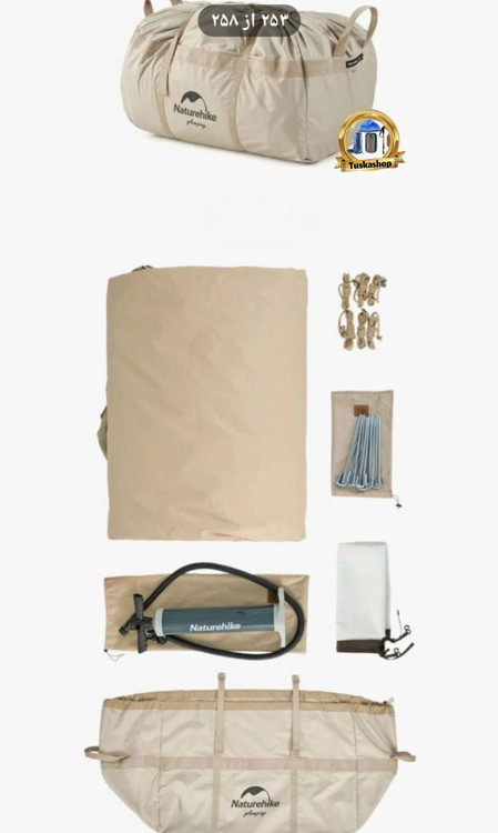 لوازم جانبی کامل: چادر همراه با لوازم جانبی مورد نیاز برای نصب و استفاده ارائه میشود که شامل 16 میخ آهنی آرنجی، 6 طناب باد، پمپ باد و کیسه ذخیرهسازی میشود. این لوازم جانبی به شما این امکان را میدهند که نصب چادر را به راحتی انجام دهید و از آن در شرایط مختلف آب و هوایی استفاده کنید.