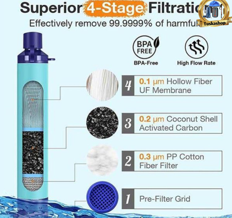 کمپینگ و کوهنوردی: در مواقعی که به آب پاک دسترسی ندارید، این نی تصفیه آب میتواند بهراحتی آب موجود را از هر منبع آبی مانند رودخانهها، جویبارها یا دریاچهها تصفیه کند.