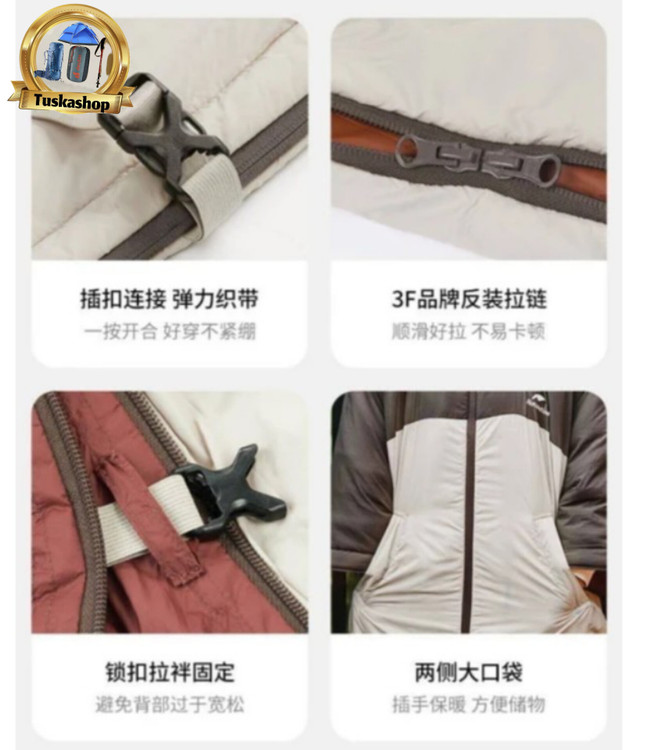 زیپ معکوس 3F: زیپ کیسه خواب از نوع کویل معکوس 3F با کیفیت بالا است که باز و بسته کردن آن بسیار راحت و روان است. این زیپ مقاوم در برابر نفوذ آب نیز میباشد.