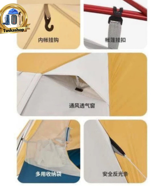 دارای آویز چراغ ،جیب داخلی ،پشه بند های درب و پنجره ،وکیف حمل وقابلیت تنفس پذیری