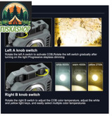 این چراغ دارای دو نوع لامپ است: یک سمت COB LED برای نور وسیعتر و یکنواخت، و سمت دیگر TG3 LED برای نور متمرکز و پرقدرت. شدت روشنایی آن بین ۶۰۰ تا ۱۵۰۰ لومن متغیر است که بسته به نیازتان میتوانید یکی از ۵ حالت نوردهی (۲۰٪، ۴۰٪، ۶۰٪، ۸۰٪، ۱۰۰٪) را انتخاب کنید. همچنین دمای رنگ نور (۲۷۰۰K، ۴۰۰۰K و ۶۰۰۰K) امکان تنظیم فضای نوری گرم یا سرد را در اختیارتان قرار میدهد.