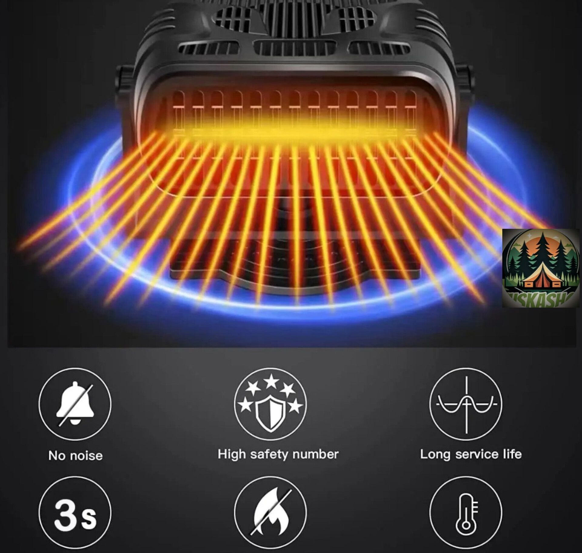 - دو حالت عملکرد — گرمایش و گردش باد: این بخاری/فن فندکی هم میتواند هوای گرم تولید کند (مناسب برای مواقع سرد یا یخزدایی شیشهها) و هم مانند یک پنکه باد خنک تابستانی ایجاد کند؛ یعنی کاربرد ۲فصلی دارد.